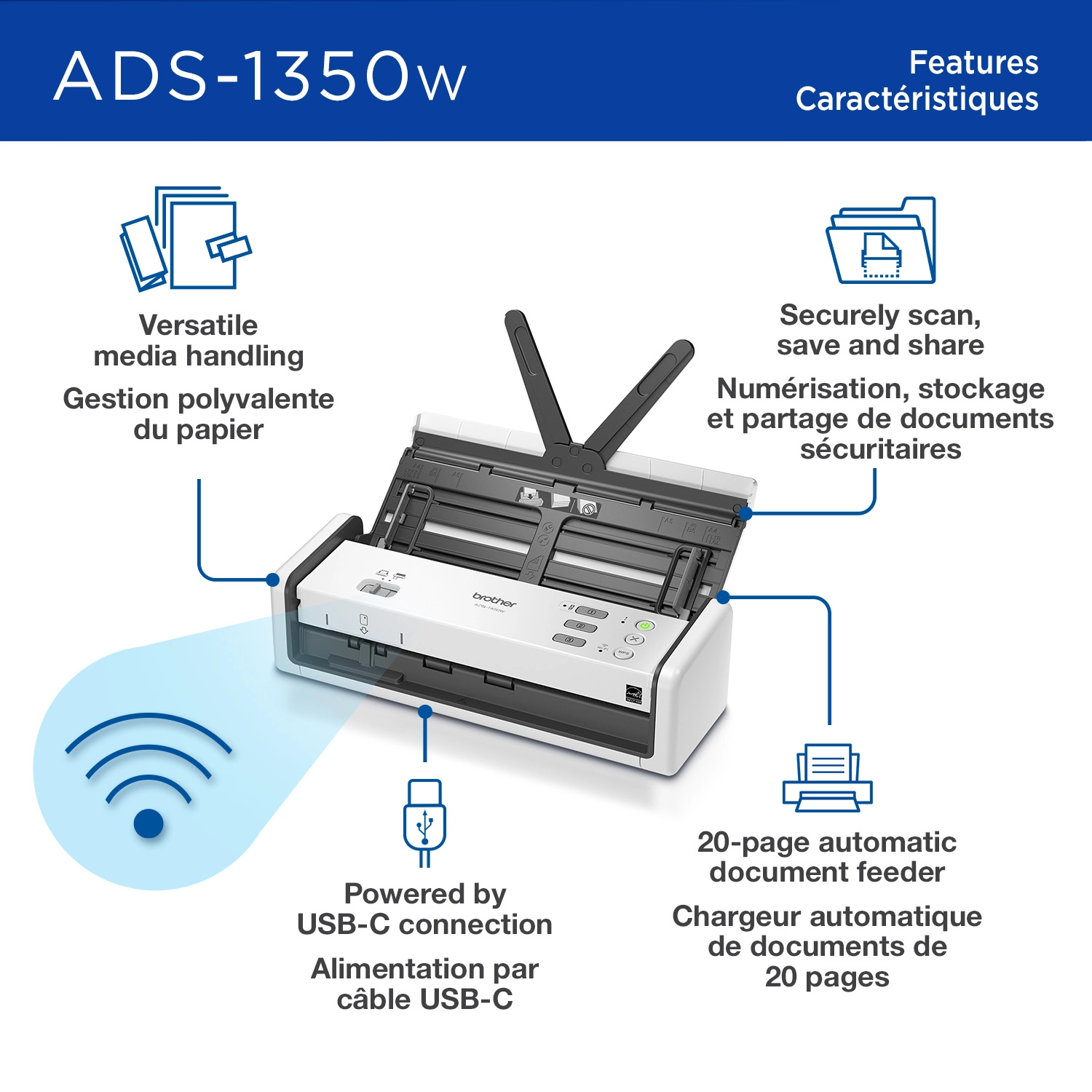 The ADS-1350W Compact Desktop Scanner blends convenience, portability and flexibility to handle documents quickly and easily. Its 20-page ADF(1) scans single and double-sided pages in a single pass and uses Brother Mobile Connect to easily send files over a Wi-Fi connection. See full product description