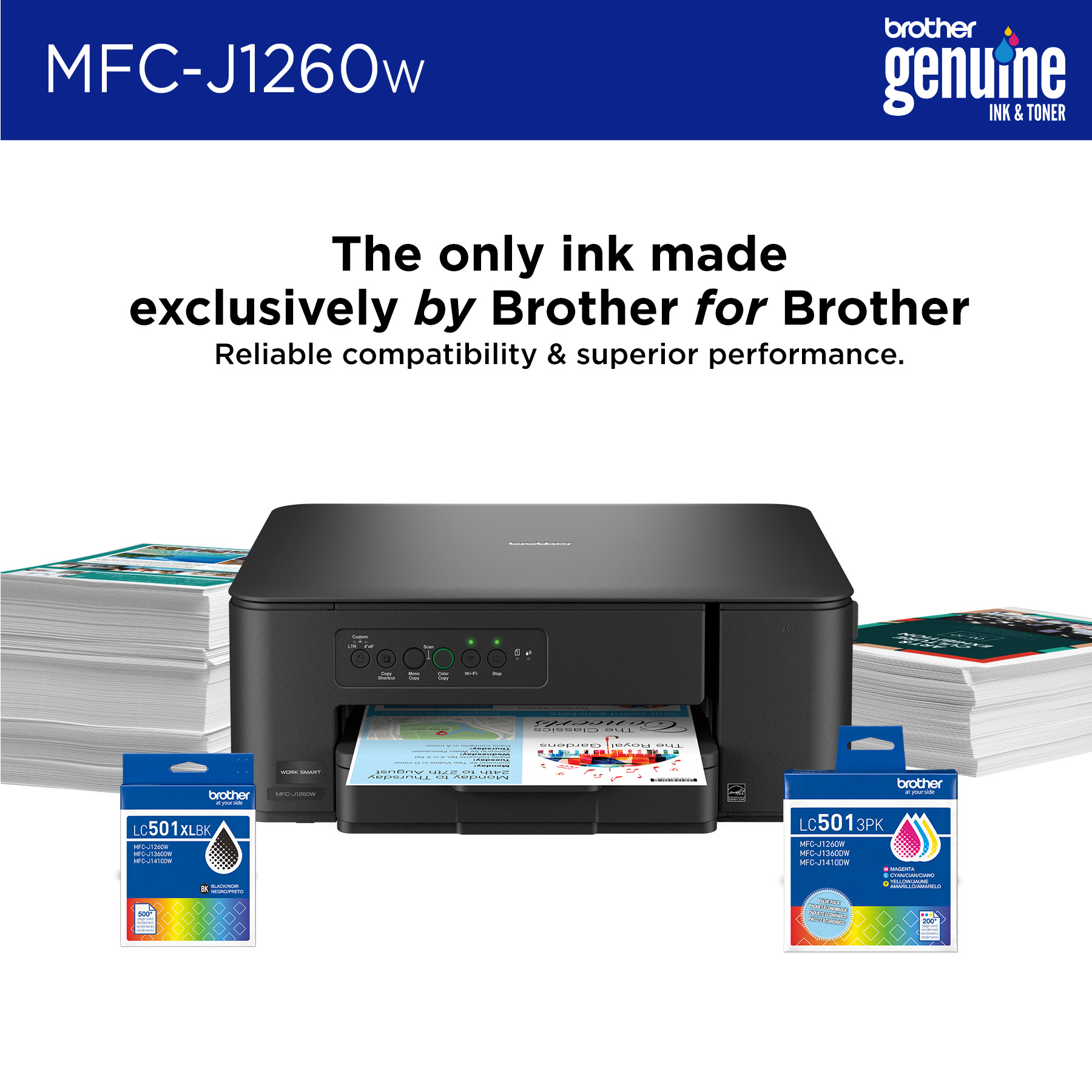 For reliable performance, count on the Brother Work Smart MFC-J1260W Wireless Colour Inkjet All-in-One Printer. Engineered to produce great prints, this printer outputs vibrant colours and rich blacks at fast print speeds. When paired with the Brother Mobile Connect app,(2) you can print from virtually anywhere. Simply put, it’s a smart investment for all your printing, copying and scanning needs.