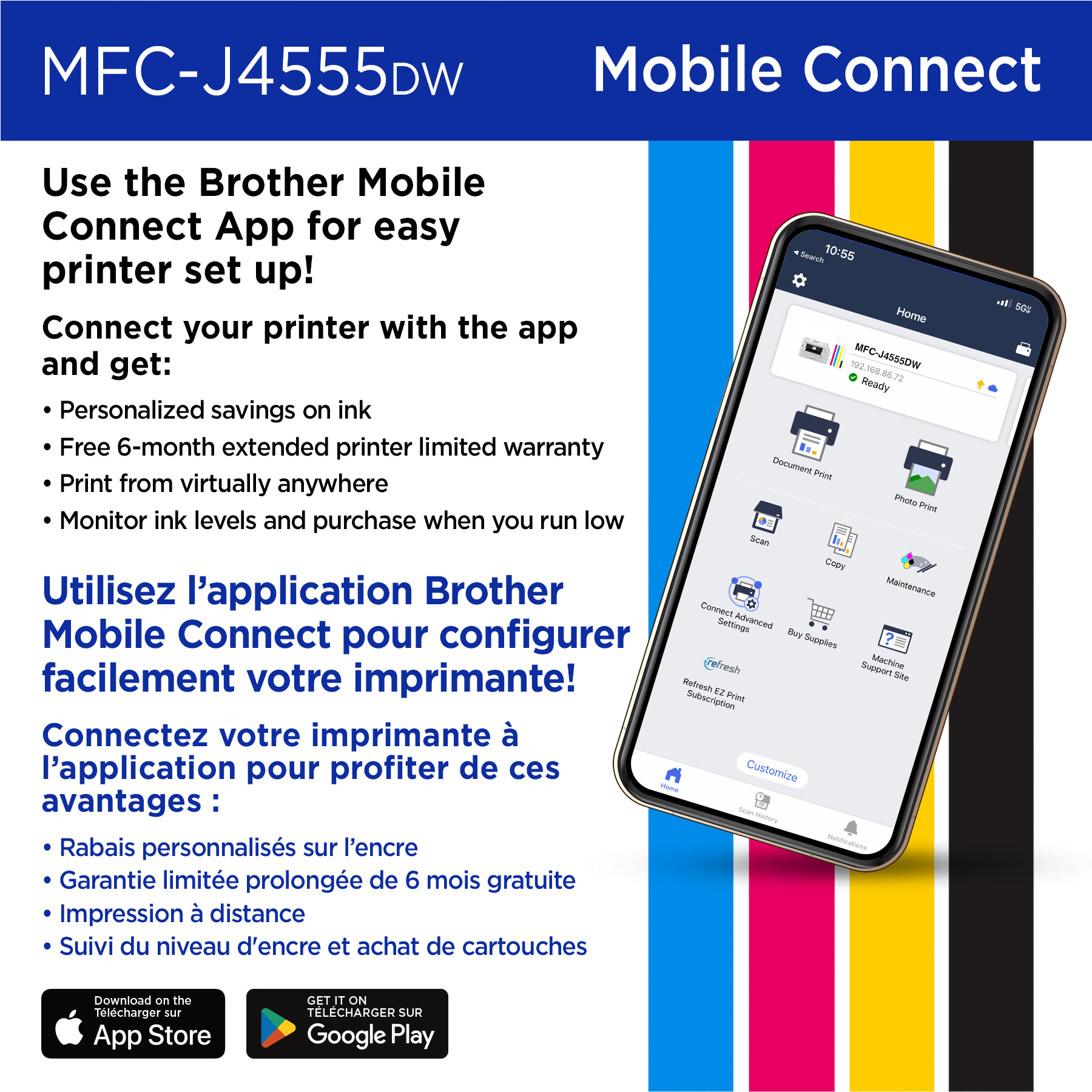 The Brother INKvestment MFC-J4555DW Wireless Colour Inkjet All-in-One Printer includes a 2.7” colour touchscreen, 400-sheet paper capacity between 2 trays,(1) 20-sheet automatic document feeder,(1) automatic duplex printing, and a 1-sheet manual feed slot(1) for convenient media handling. Plus, you’ll be able to print on-the-go with the Brother Mobile Connect app.(4) What’s more, the MFC-J4555DW is compatible with Brother’s Refresh EZ Print Subscription Service and qualifies for ink reordering plans based on your printing needs. Subscribe and save up to 50% on Brother Genuine Ink. It even works with Alexa.