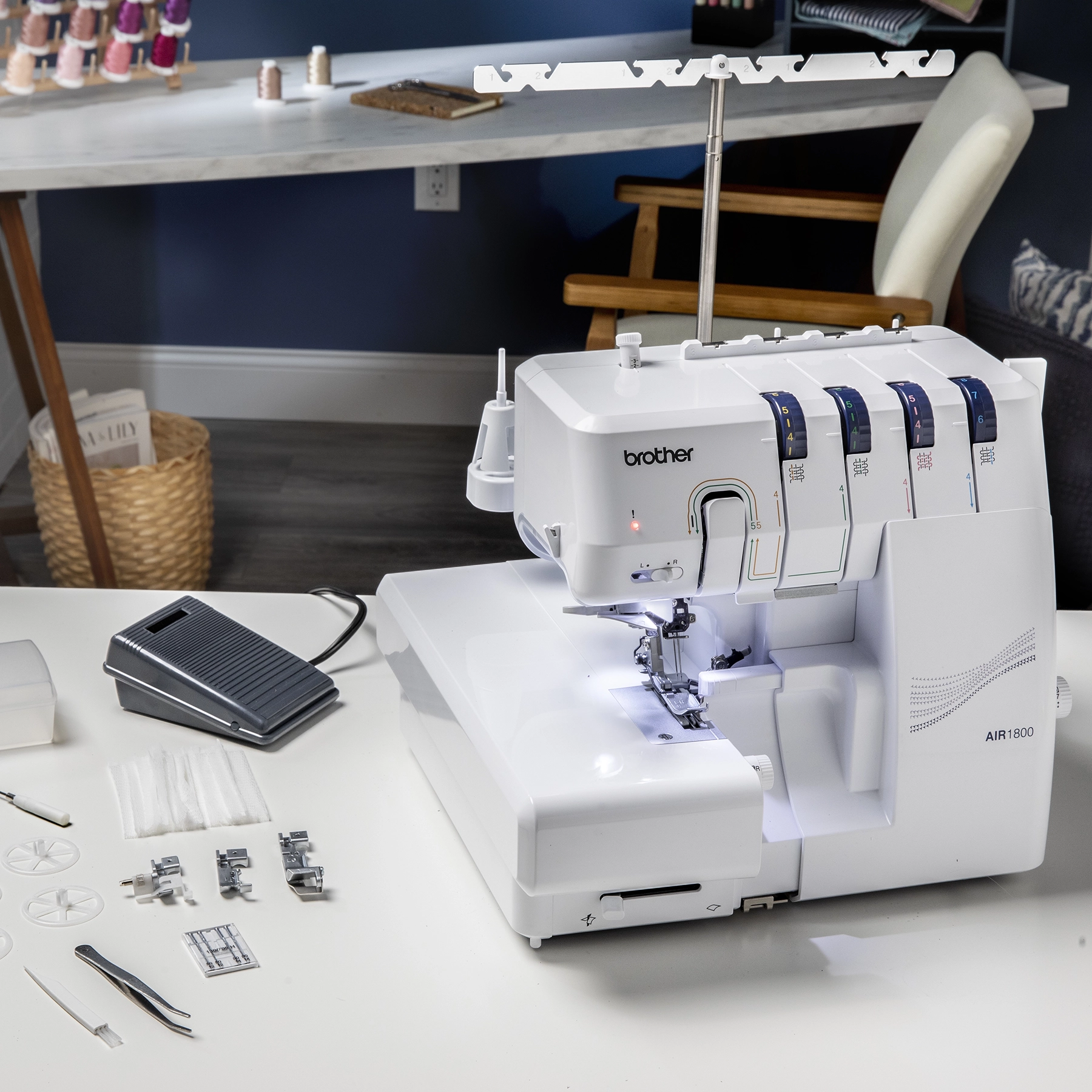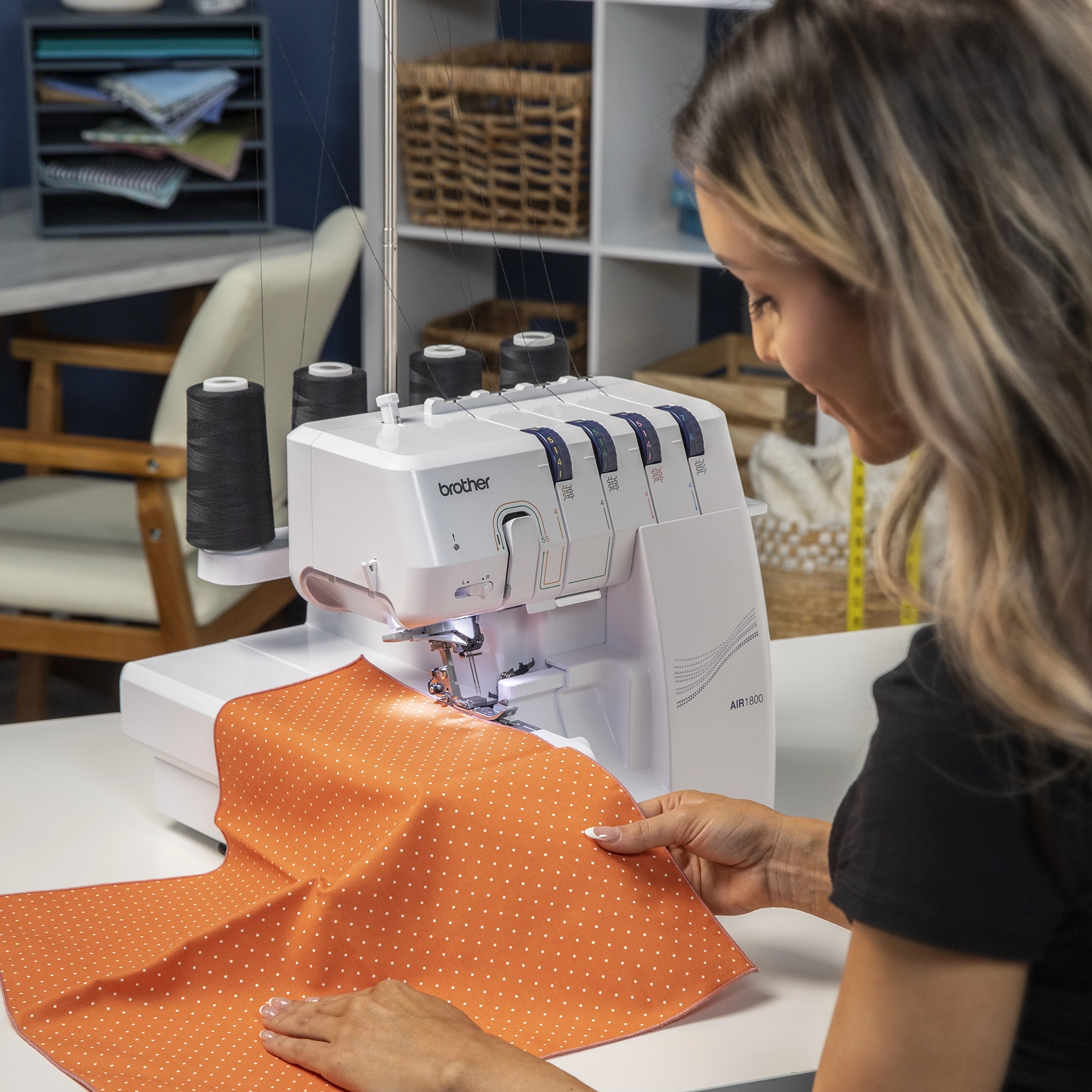 Ajoutez des touches de finition professionnelles à vos projets avec la surjeteuse à air AIR1800 de Brother et sa technologie d’enfilage à jet d’air. Excellent ajout à votre atelier couture, cette machine est équipée d’un voyant DEL qui vous avise quand le couvercle du tissu est ouvert, de deux leviers de changement rapide pour ourlets roulottés open et d’une touche d’activation du découseur. Grâce aux ports d’enfilage optimisés qui sont reliés à l’extrémité de chaque boucleur par des tubes et aux jets d’air qui envoient les fils dans les boucleurs sur simple pression d’un bouton, changer de couleur de fil se fait en un coup de vent!