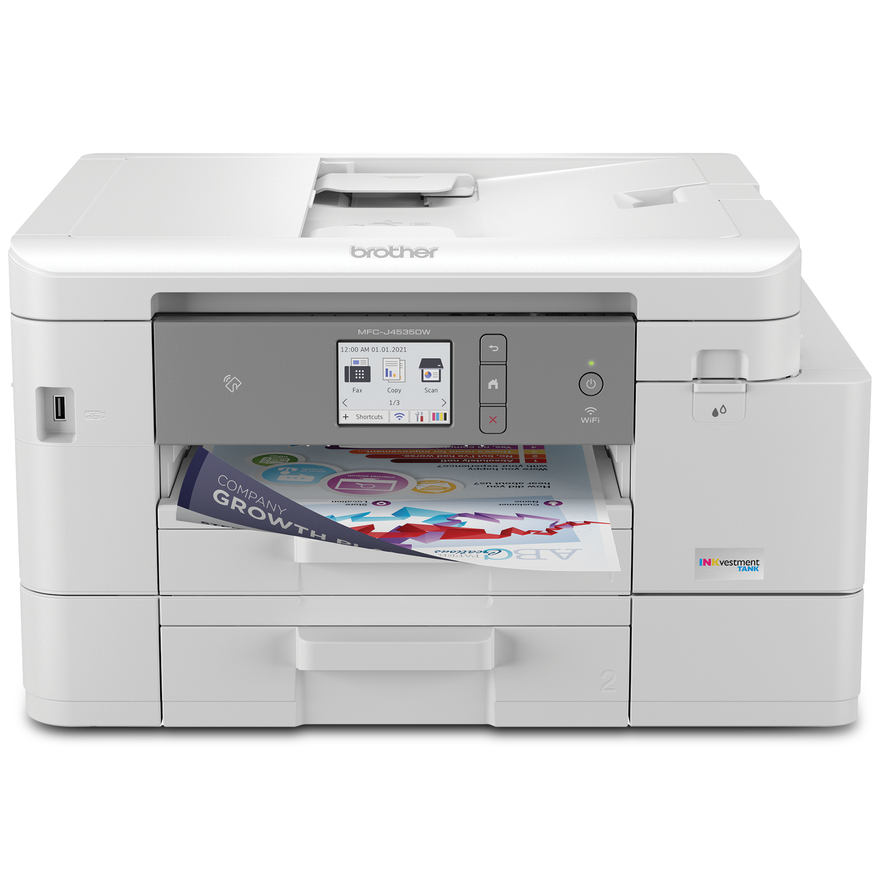 Le MFC-J4535DW est une imprimante tout-en-un qui imprime, copie, numérise et faxe. Cette imprimante multifonction est conçue pour la productivité avec sa gestion polyvalente du papier qui comprend l'impression recto-verso, un bac à papier de 400 feuilles et un chargeur automatique de documents de 20 feuilles.