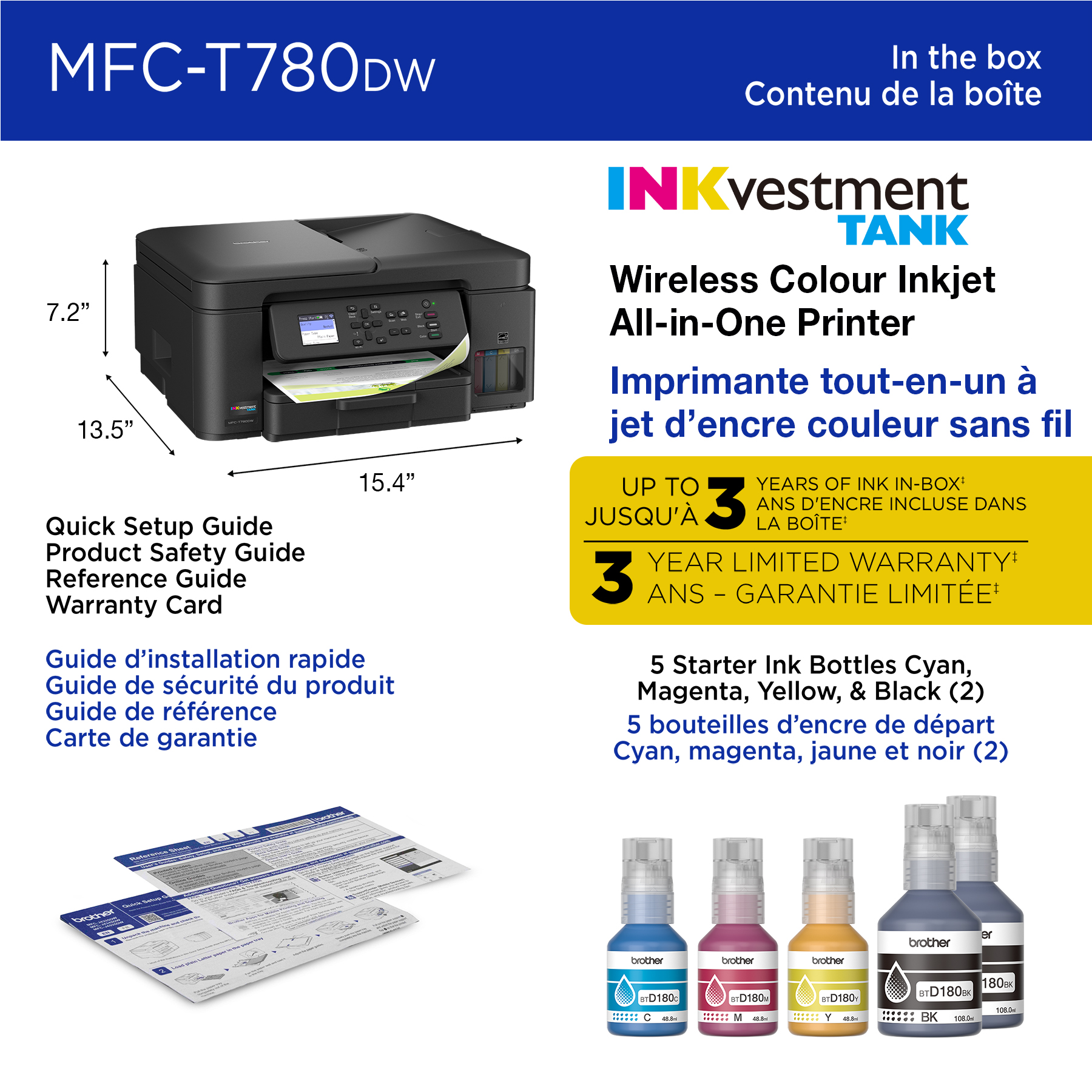 | Contenu de la boîte | Brother MFC-T780DW, 2 bouteilles d’encre de départ noire (2 bouteilles permettent d’imprimer env. 14 625 pages), bouteilles d’encre de départ cyan, magenta et jaune (env. 4 400 pages), cordon d’alimentation c.a., Guide de sécurité du produit, Guide de référence, carte de garantie, Guide d’installation rapide |