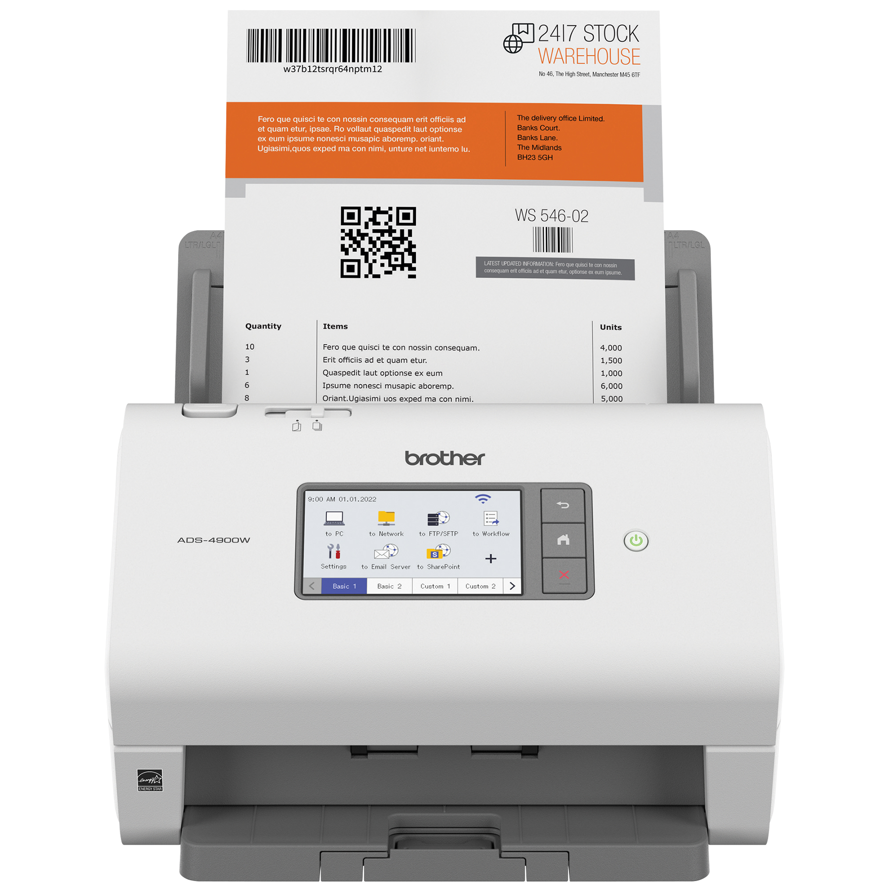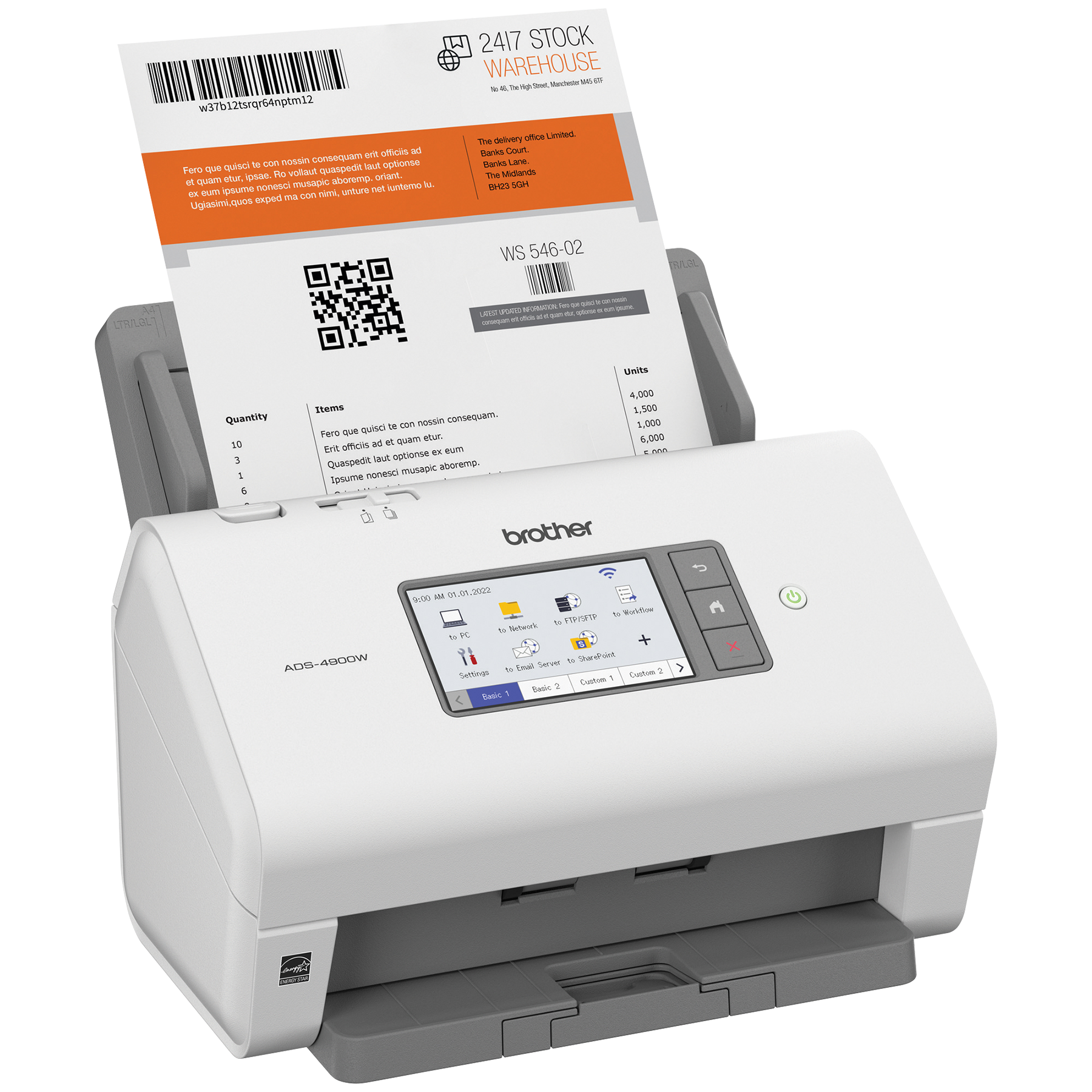 Le scanner de bureau professionnel ADS-4900W de Brother est conçu pour le monde du travail d'aujourd'hui. S’intégrant facilement à vos flux de travail, il offre des fonctions de sécurité avancées et accroit la productivité des entreprises et groupes de travail ayant des volumes de numérisation élevés. Doté d'une fonction de numérisation recto verso rapide (jusqu'à 60 ppm), il numérise rapidement des piles de papier de différents formats à partir de son chargeur automatique de documents de 100 pages. Son écran tactile couleur de 4,3 po comprend un menu facile à naviguer et permet de créer jusqu'à 56 raccourcis personnalisés pour numériser en une seule étape vers des destinations multiples et prévisualiser les documents. Ses fonctions de sécurité à trois couches limitent l'accès à l'appareil et aux documents et protègent l'appareil contre toute intrusion. Prenant en charge de nombreux pilotes (TWAIN, WIA, ISIS et SANE), il est compatible avec plusieurs applications et systèmes existants et il permet de numériser vers une variété d'applications en nuage (Google Drive™, Dropbox, OneDrive, courriels, SharePoint, serveurs SSH [SFTP], clés USB, etc.). Sa puissante suite logicielle permet de créer et de modifier des documents numérisés et de les convertir en différents formats (fichiers PDF interrogeables, fichiers PDF protégés, Word, Excel et PowerPoint). Ses fonctionnalités d'optimisation de l'image, comme le réalignement automatique, la rotation automatique des images et la suppression des bavures, produisent des résultats de qualité. Doté d'interfaces réseau sans fil bibande (2,4 GHz/5 GHz) et Ethernet, il est facile à configurer et à partager sur votre réseau et permet de numériser vers votre appareil mobile à l'aide d'AirPrint et de Brother Mobile Connect. L'ADS-4900W est homologué ENERGY STAR et EPEAT argent, et est assorti d'une garantie limitée d'un an et du soutien technique en ligne ou par clavardage en direct gratuit pour toute sa durée de vie.